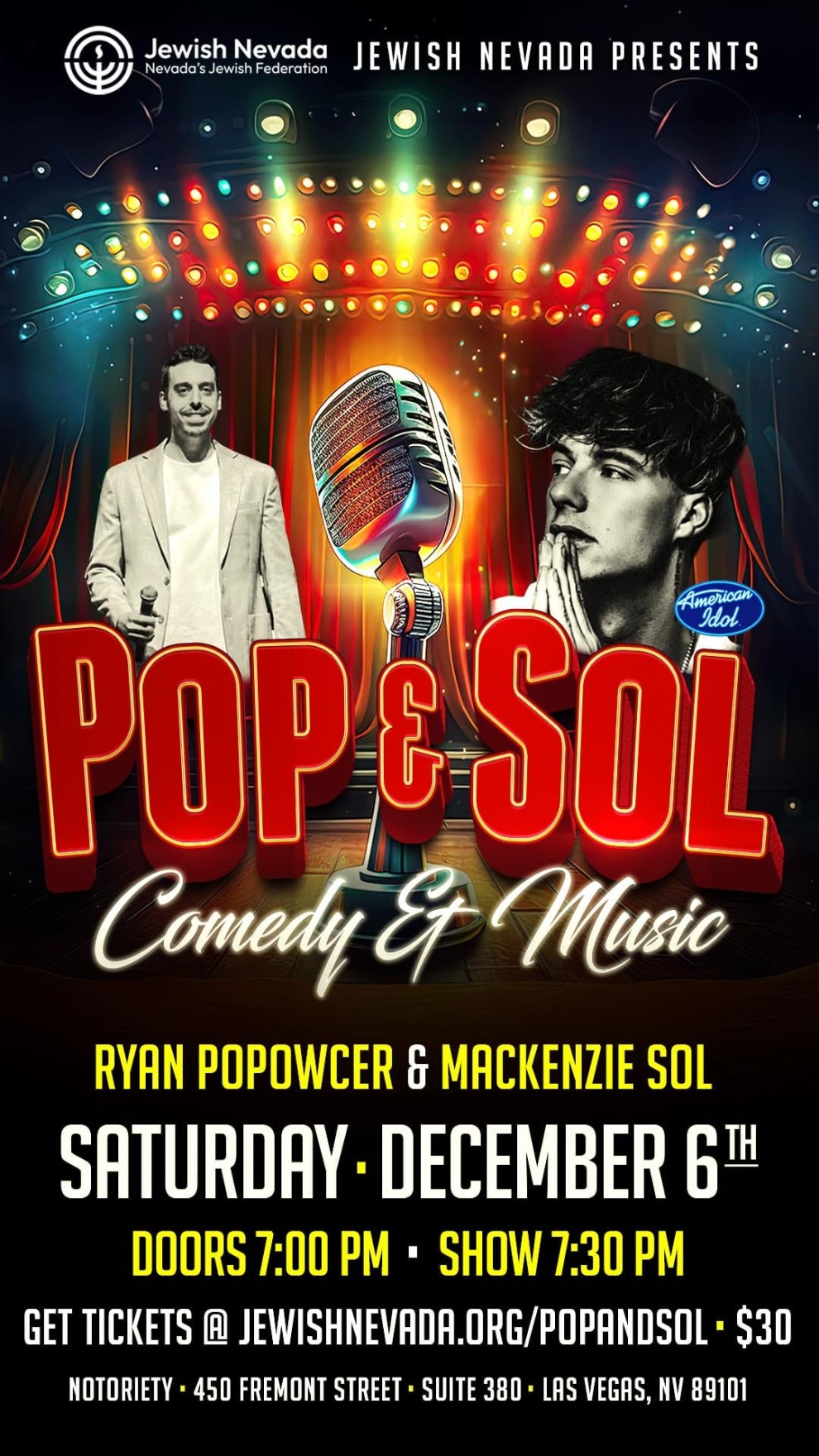 Get ready for an unforgettable evening of comedy, music, and community! Join Jewish Nevada’s Young Leaders Division (YLD) for a one-of-a-kind night featuring stand-up comedian Ryan Popowcer- one of our own young leaders bringing the laughter- followed by a live performance from Mackenzie Sol, American Idol finalist and rising star.