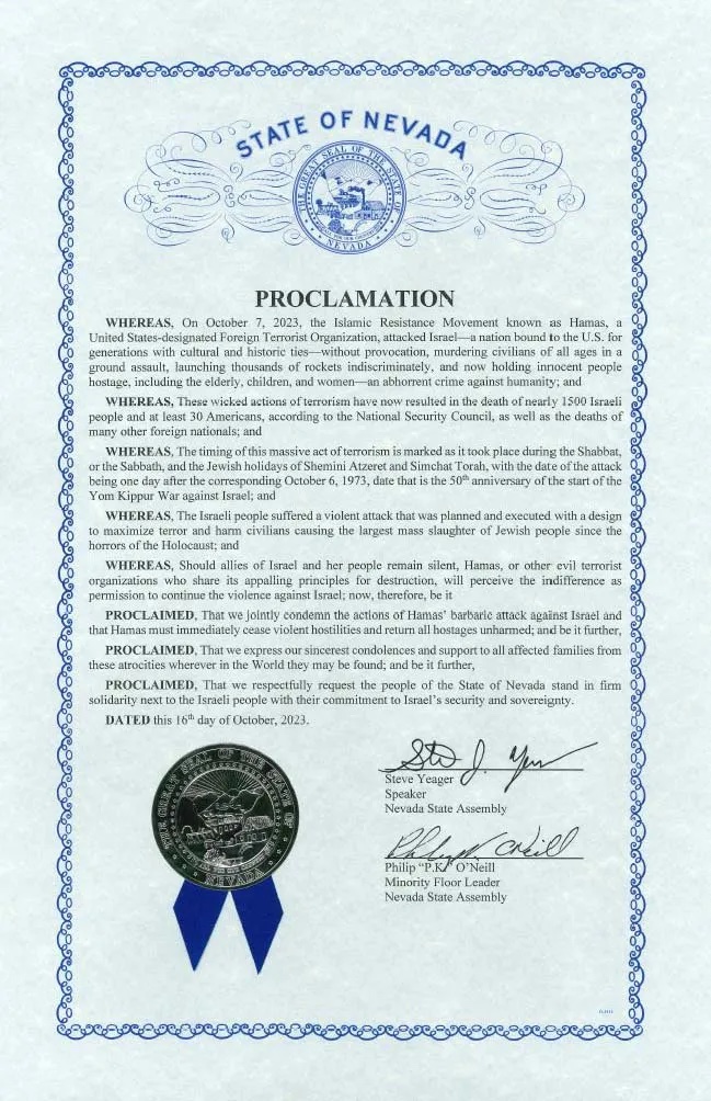 On October 16, 2023, Democratic and Republican leaders in the Nevada Assembly issued a proclamation unequivocally condemning the Hamas attacks and reiterating support for Israel in Nevada.