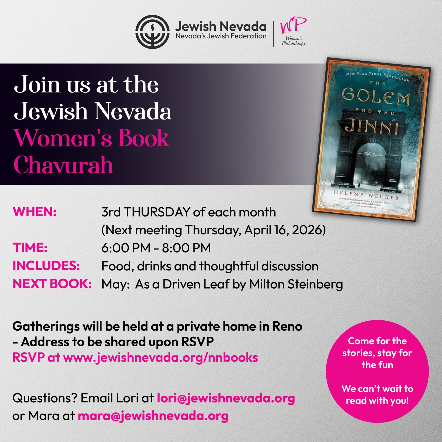 Join Jewish Nevada's Women’s Book Chavurah and connect with other women who share a passion for great stories, meaningful conversation, and good comp...