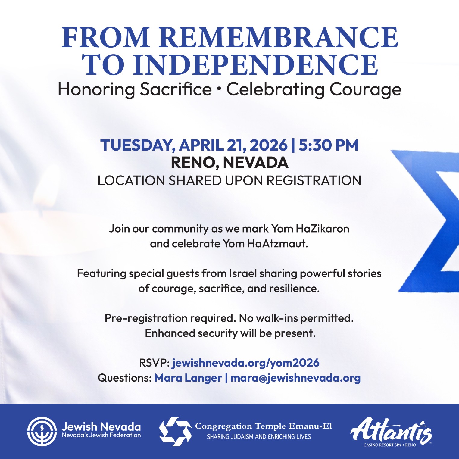 Join us as our community gathers to observe Yom HaZikaron and celebrate Yom HaAtzmaut.